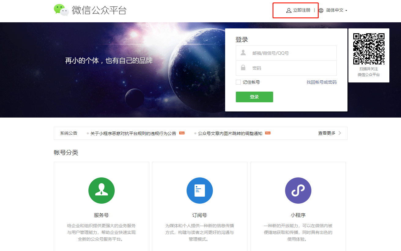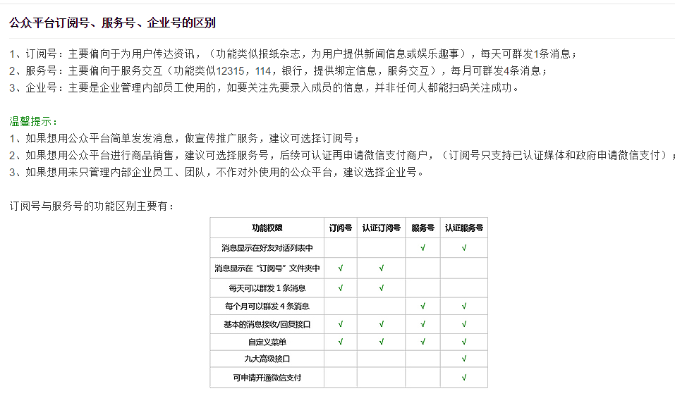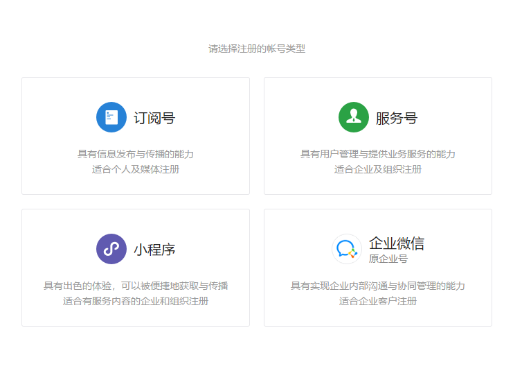 了解訂閱號(hào)、服務(wù)號(hào)和企業(yè)微信的區(qū)別后,選擇想要的帳號(hào)類(lèi)型;