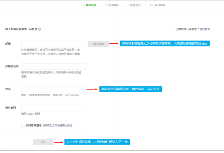 微信公眾號(hào)注冊(cè)規(guī)則多變,此處為現(xiàn)在注冊(cè)大體流程。僅供參考,實(shí)際以注冊(cè)時(shí)操作為準(zhǔn)??!