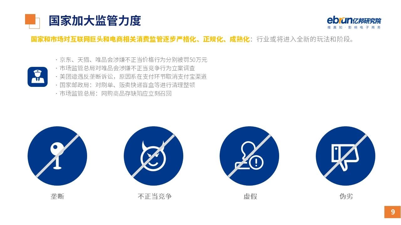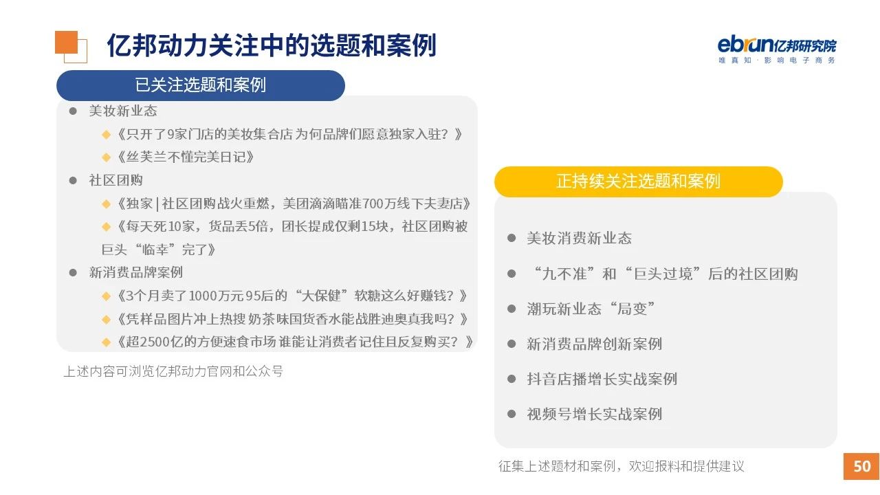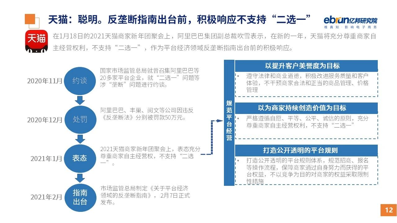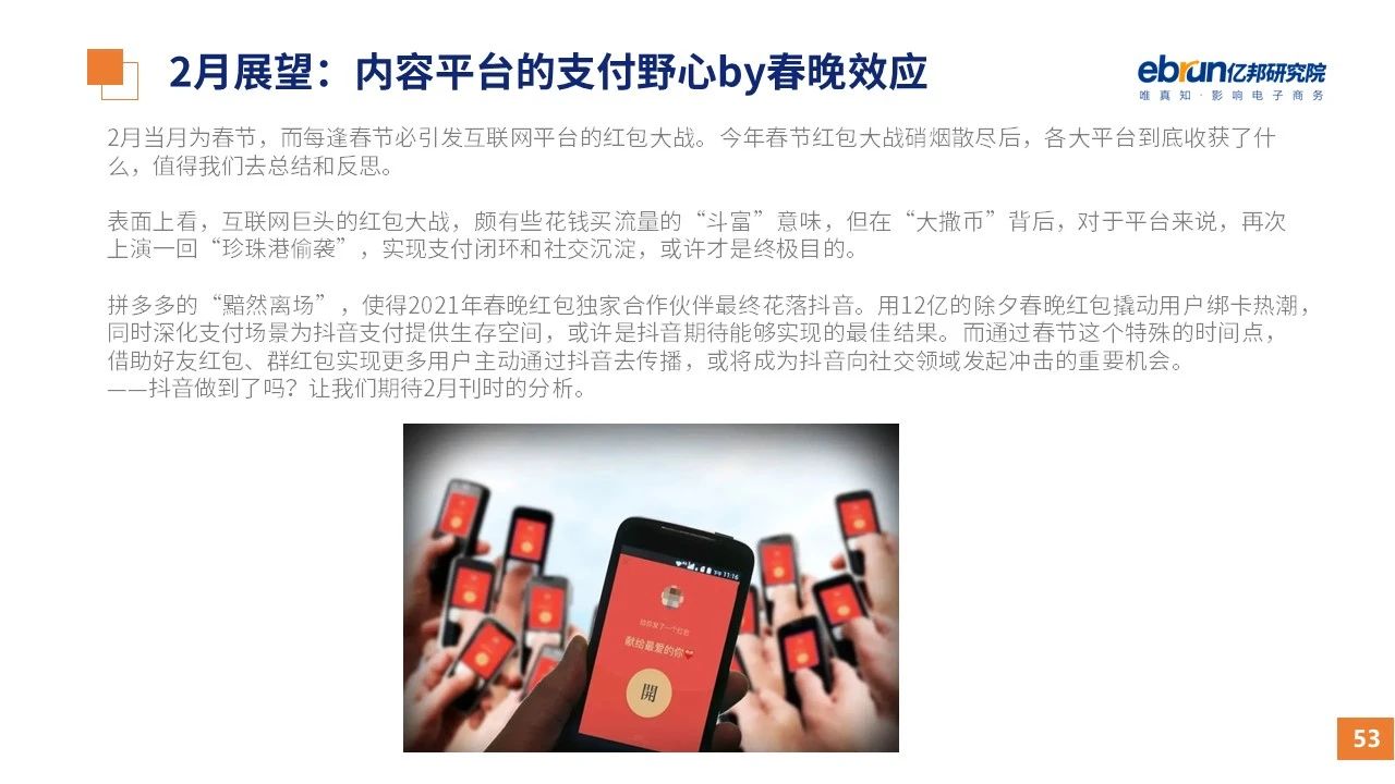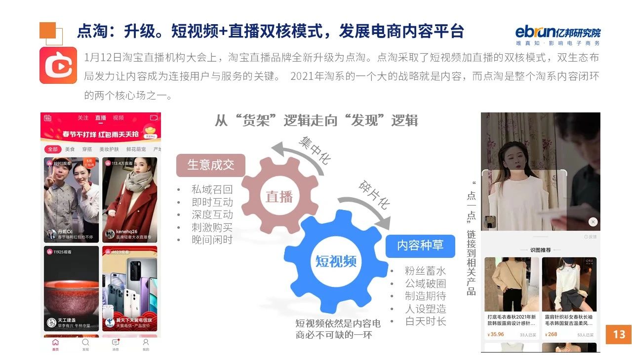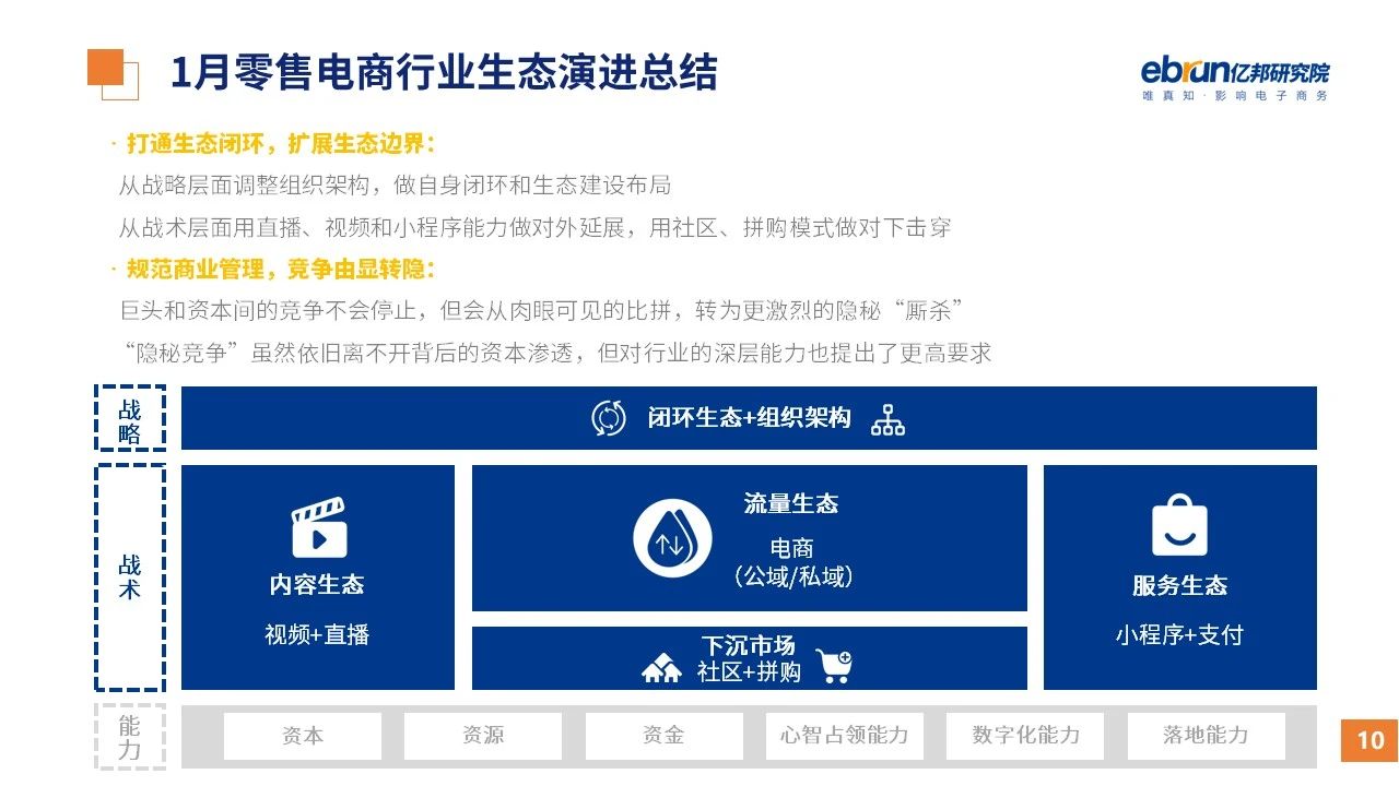縱觀2021年1月,各平臺(tái)豐富自有生態(tài)布局,如淘寶直播(點(diǎn)淘)加入短視頻模式、騰訊重押視頻號(hào)、快手加碼電商和小程序、抖音推出支付等;視頻內(nèi)容成為各平臺(tái)未來重點(diǎn)發(fā)力方向;“九不得”新規(guī)發(fā)布后社區(qū)團(tuán)購仍熱情不減;國家和市場對(duì)互聯(lián)網(wǎng)巨頭和電商相關(guān)消費(fèi)加大監(jiān)管力度……你信和不信,你知道和不知道的,都在這份億邦動(dòng)力研究院正式發(fā)布的